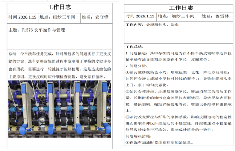 “参数每调 0.1,纱线强度就跟着变。”该校纺织工程专业2023级学生李思玲一边紧盯设备数据,一边和同伴交流心得。身旁的非织造材料与工程专业23级学生王钰俯身观察纱线走向,笔记本上早已密密麻麻记满操作要点。在细纱三车间,农守锋完成洗车任务后,针对缠包问题优化了皮辊更换方案;鲁雪林在处理粗纱头、洗车过程中,精准分析出油污对纱线染色、断头率、条干均匀度的影响,并提出控制加油量的解决方案。