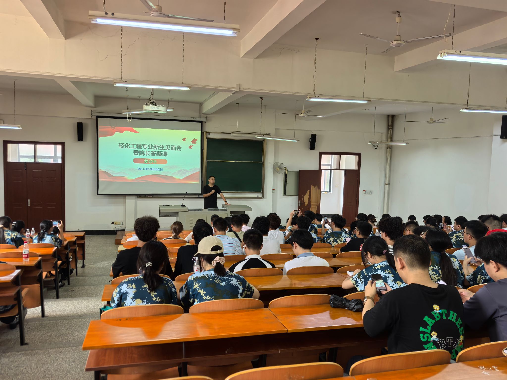 分专业开展了院长答疑课。副院长夏治刚(主持工作)围绕“何谓大学生?”“如何成为PHD?”两个关键问题,寄语新生要树立远大志向,做到“大人学、大量学、大师学”——即培养大格局、积累大知识、追寻大师境界。副院长姜会钰从“轻资源、化技术、强应用”三大定位出发,系统梳理了轻化专业发展方向,介绍了“化学基础、专业核心、方向选修、实践应用”四位一体的课程体系,列举了纺织染整、皮革日化、造纸、环保检测、科研院所等多类就业单位与岗位,鼓励新生主动规划大学生涯,夯实化学基础,积极投身实践,早日成长为具备创新能力和绿色视野的高素质工程技术人才。