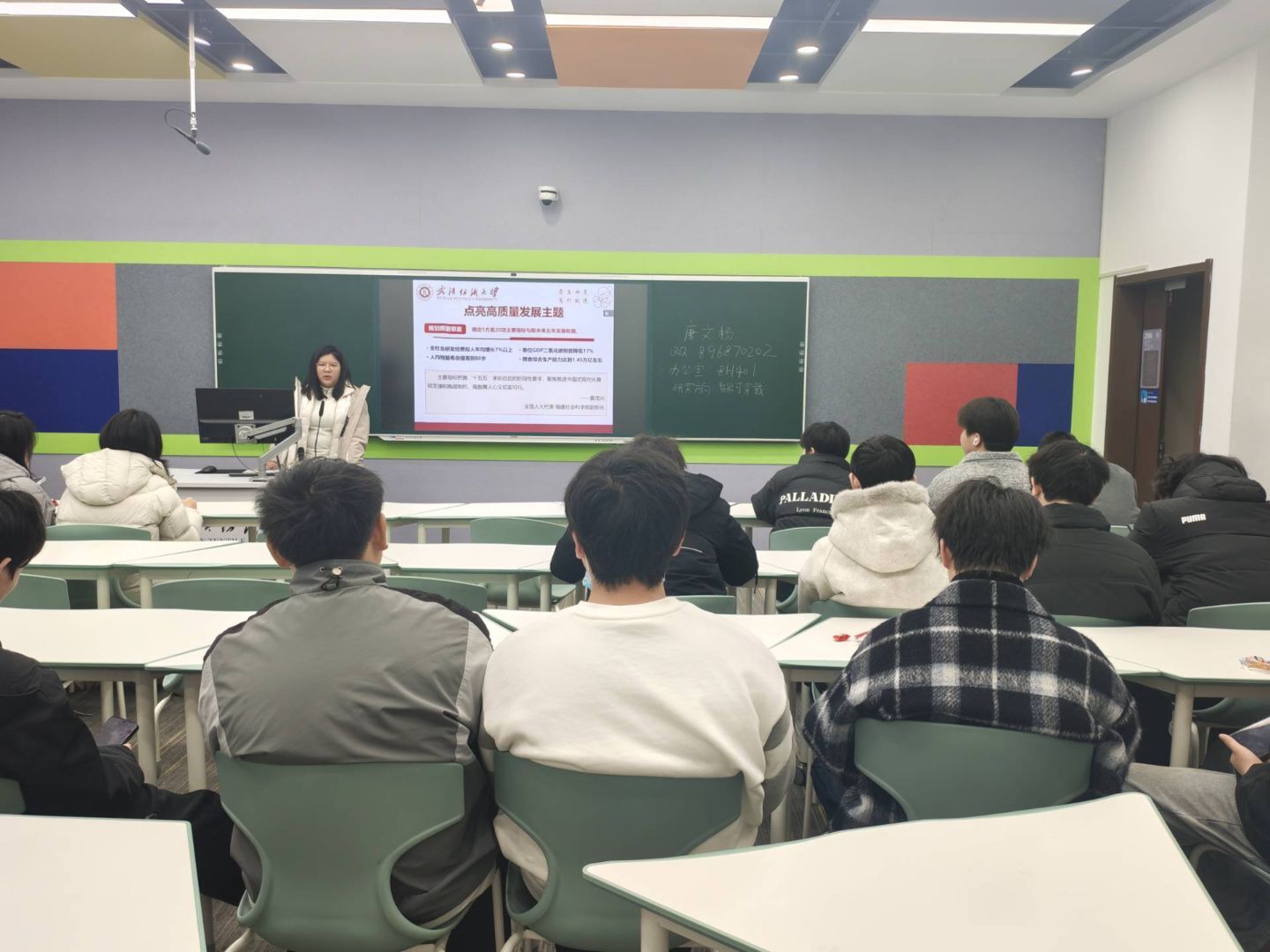 班会中,老师带领同学们从全国两会看未来五年发展新方向,围绕高质量发展核心,介绍了未来五年的发展指标和109项重大工程,讲解了国家培育新产业、发展人工智能的相关规划,以及促进消费、增加收入、推动共同富裕的具体举措,让同学们了解到国家在稳经济、强创新、保民生、守安全上的坚定行动和务实办法。